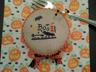 My final finish was "Bubble and Froth" from Mindi at Joie de Vivre. The "girls" were stitched on 32 ct PTP Tarnish and I added some glitz to give the piece a bit of color. The moon, cat's eyes and cauldron bubbles were stitched with metallic threads. I couldn't resist the metallic ricrac and sparkly button. Thank you, Mindi for a fun design.
